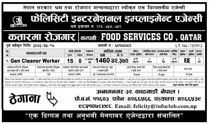 Job Vacancy in Qatar, Salary Rs 42,370 Recruiting Agency FELICITY INTERNATIONAL…